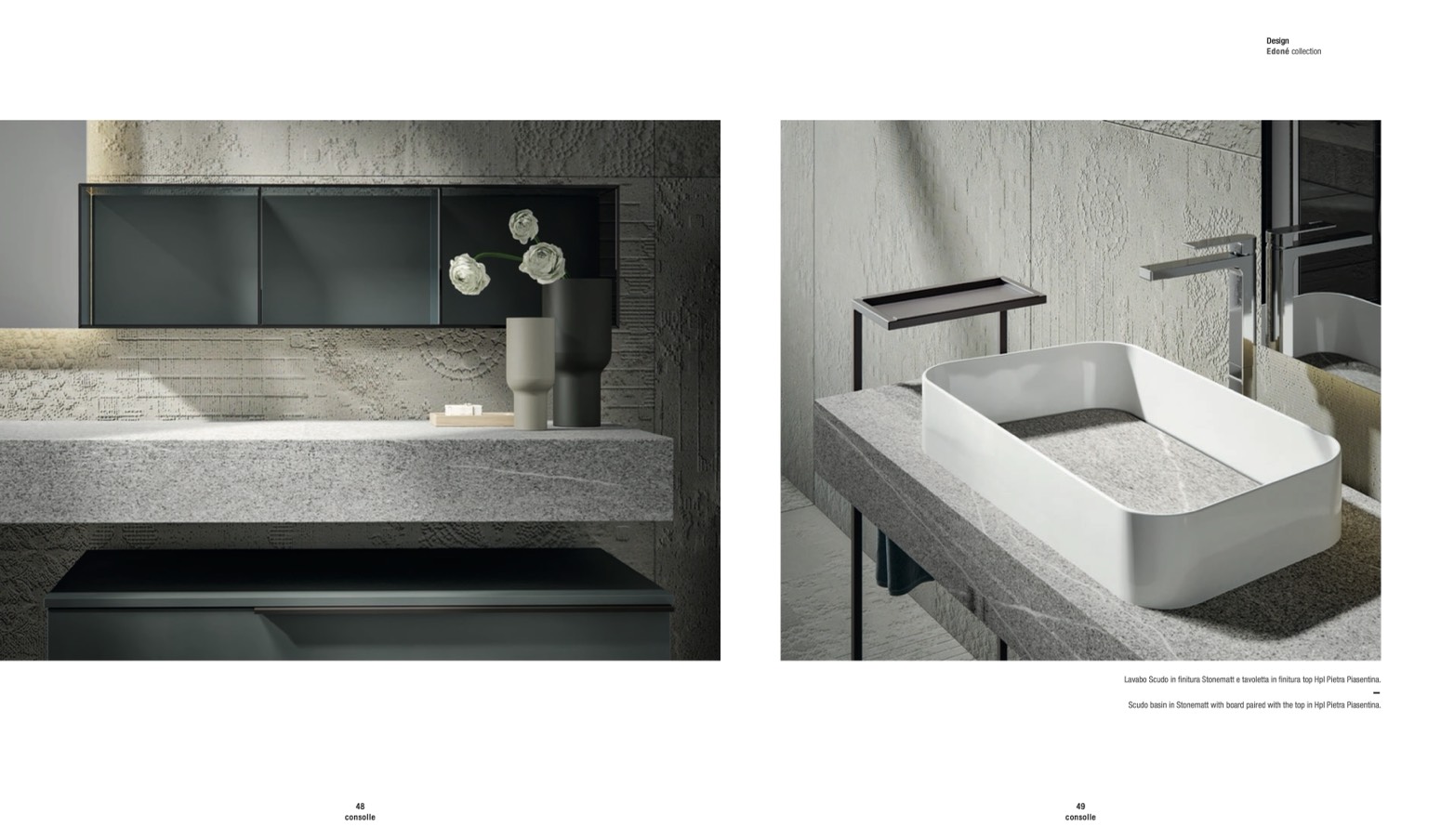 Lavabo Scudo in finitura Stonematt e tavoletta in finitura top Hpl Pietra Piasentina.