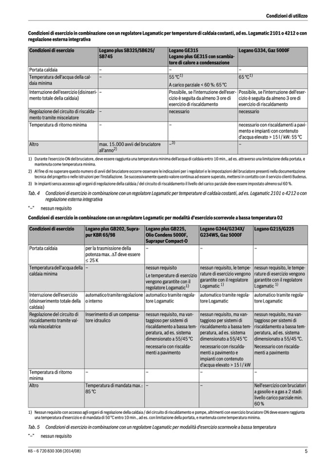 Tab. 5 Condizioni di esercizio in combinazione con un regolatore Logamatic per modalità d'esercizio scorrevole a bassa temperatura