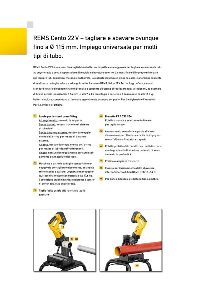 REMS Cento 22 V è una macchina tagliatubi a batteria compatta e maneggevole per tagliare velocemente tubi