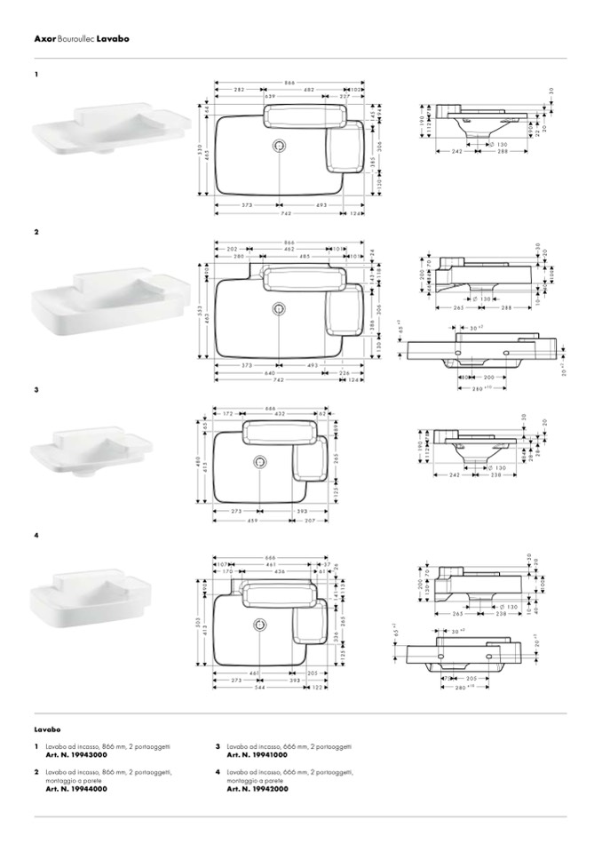4 Lavabo ad incasso, 666 mm, 2 portaoggetti,