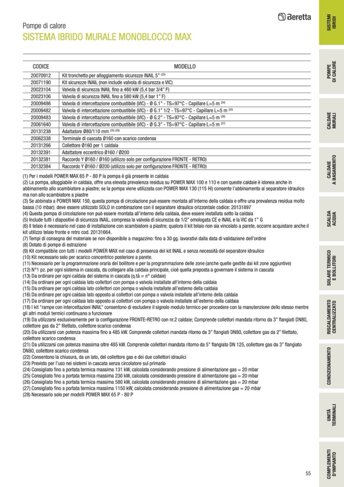 (20) Da utilizzarsi con potenza massima fino a 485 kW. Comprende collettori mandata ritorno da 3” flangiati DN80, collettore gas da 2” filettato,