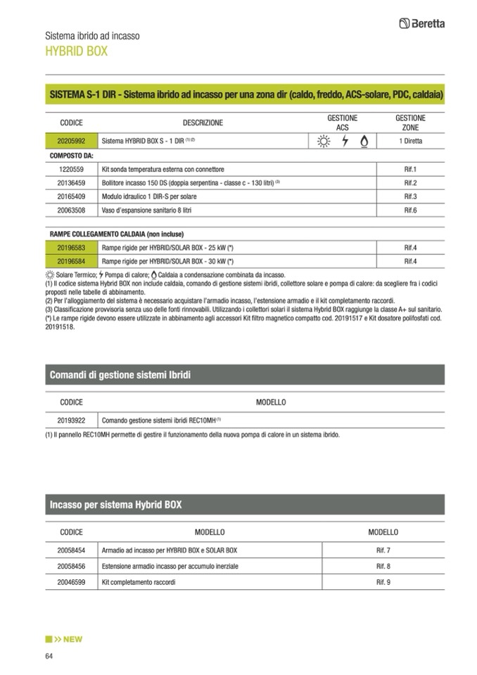 (1) Il codice sistema Hybrid BOX non include caldaia, comando di gestione sistemi ibridi, collettore solare e pompa di calore: da scegliere fra i codici