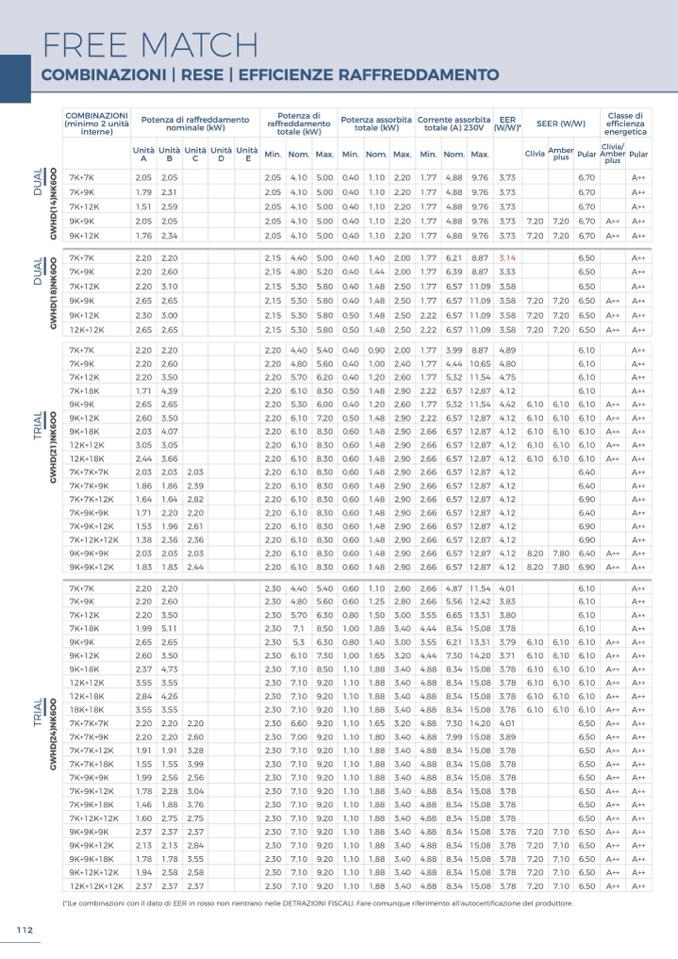 (*)Le combinazioni con il dato di EER in rosso non rientrano nelle DETRAZIONI FISCALI. Fare comunque riferimento all’autocertificazione del produttore.
