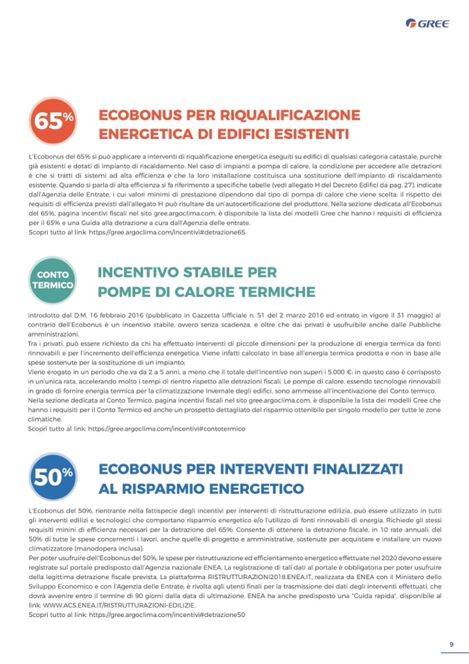 del 65%, pagina incentivi fiscali nel sito gree.argoclima.com, è disponibile la lista dei modelli Gree che hanno i requisiti di efficienza