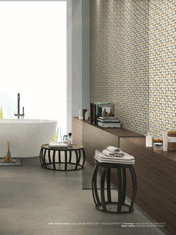 wall: decoro waves matte 120x280 471/4”x1101/4” / 60x120 235/8”x471/4” cinnamon matte ptv 60x120 235/8”x471/4”