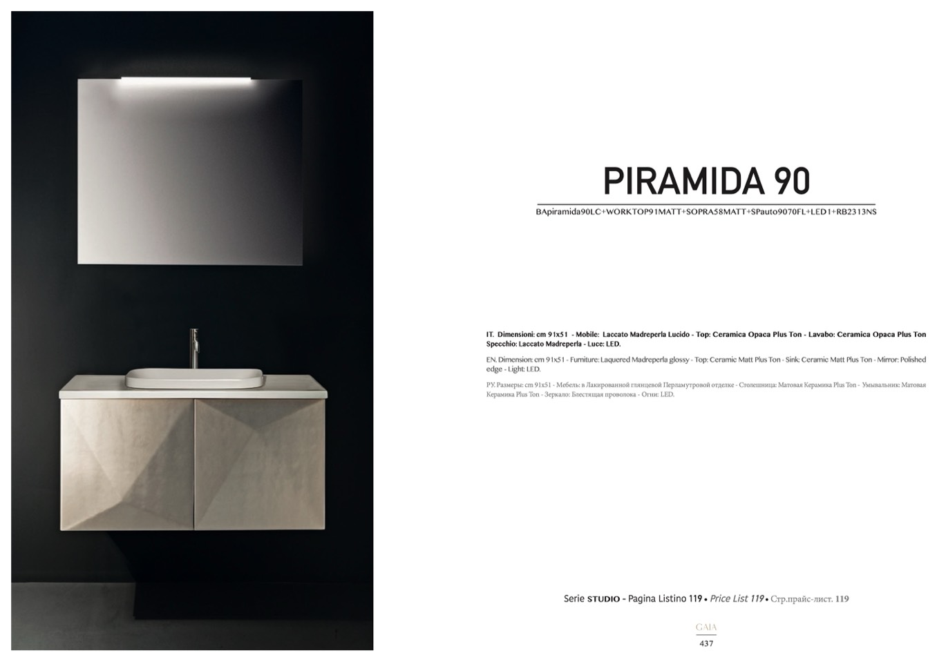 EN. Dimension: cm 91x51 - Furniture: Laquered Madreperla glossy - Top: Ceramic Matt Plus Ton - Sink: Ceramic Matt Plus Ton - Mirror: Polished