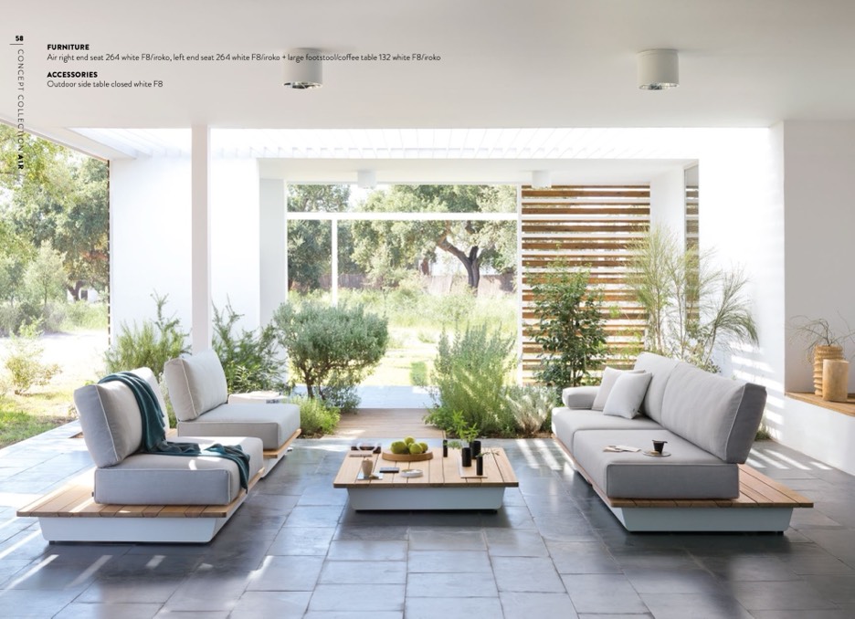 Air right end seat 264 white F8/iroko, left end seat 264 white F8/iroko + large footstool/coffee table 132 white F8/iroko