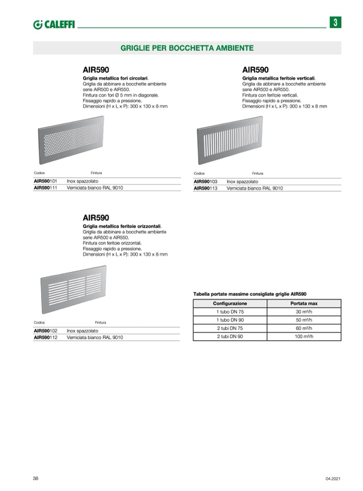 Tabella portate massime consigliate griglie AIR590