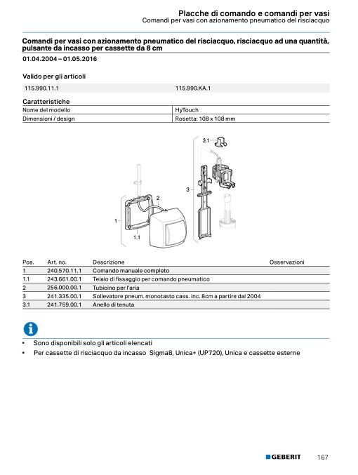 Comandi per WC con azionamento pneumatico del risciacquo, risciacquo ad una quantità, pulsante