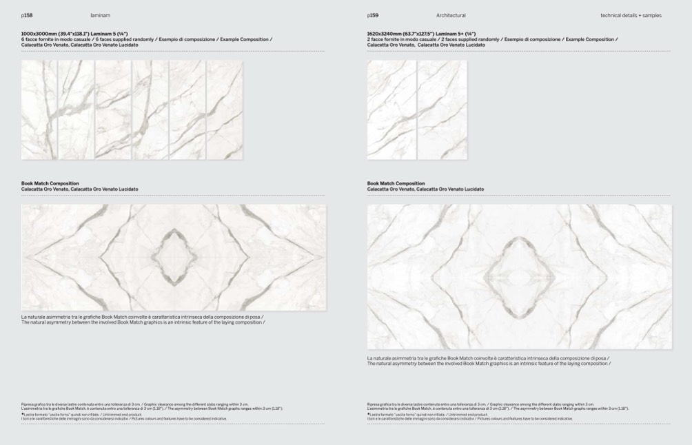 L’asimmetria tra le grafiche Book Match, è contenuta entro una tolleranza di 3 cm (1.18”). / The asymmetry between Book Match graphs ranges within 3 cm (1.18”).