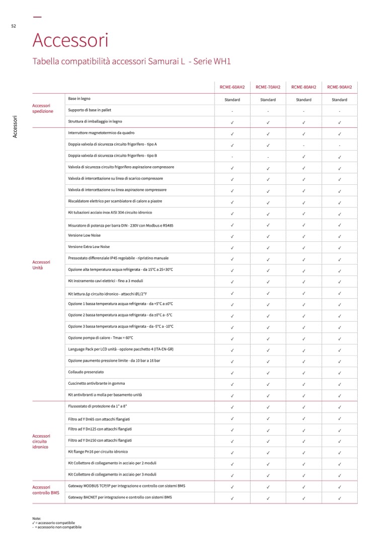 - = accessorio non compatibile