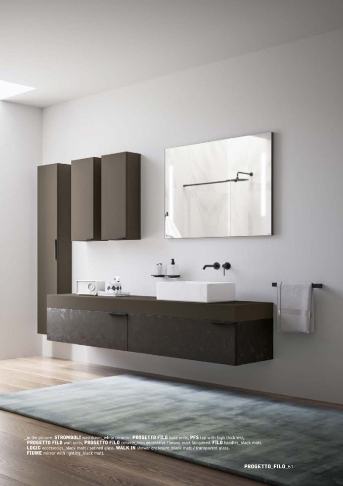 _in the picture: STROMBOLI washbasin_white ceramic. PROGETTO FILO base units, PFS top with high thickness,