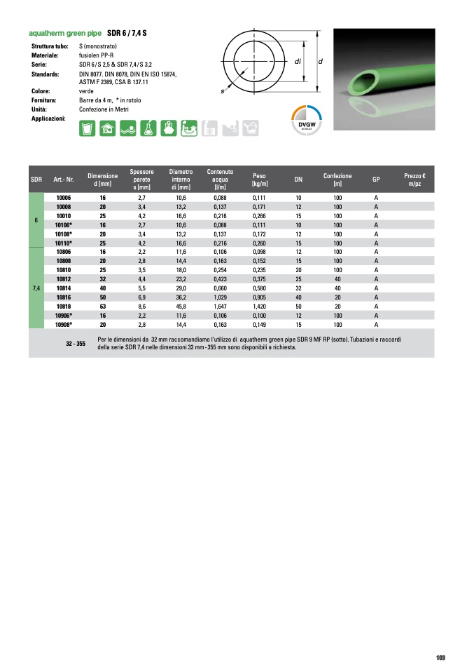 Per le dimensioni da 32 mm raccomandiamo l‘utilizzo di aquatherm green pipe SDR 9 MF RP (sotto). Tubazioni e raccordi