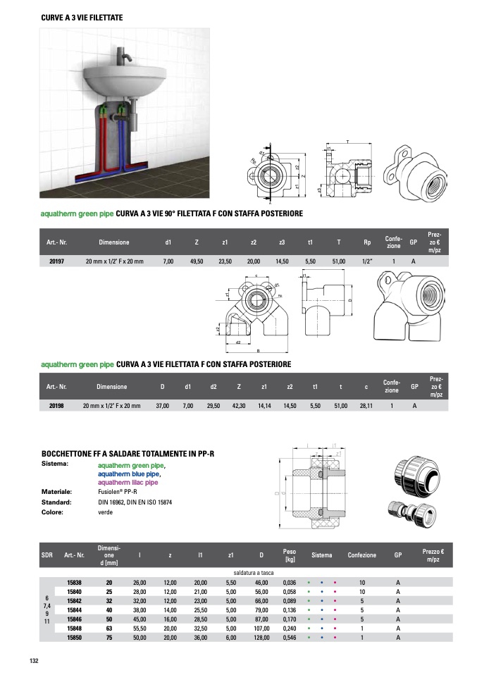 aquatherm green pipe CURVA A 3 VIE 90° FILETTATA F CON STAFFA POSTERIORE