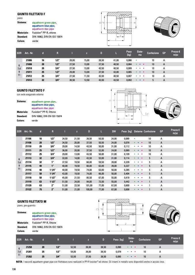 NOTA: I raccordi aquatherm green pipe con filettatura sono realizzati in PP-R fusiolen