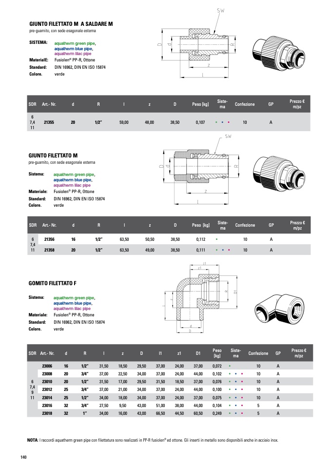 NOTA: I raccordi aquatherm green pipe con filettatura sono realizzati in PP-R fusiolen