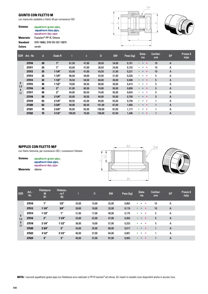 NOTA: I raccordi aquatherm green pipe con filettatura sono realizzati in PP-R fusiolen