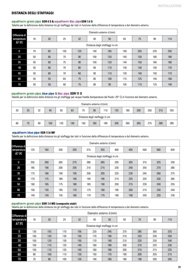 Tabella per la definizione della distanza tra gli staffaggi dei tubi in funzione della differenza di temperatura e del diametro esterno.