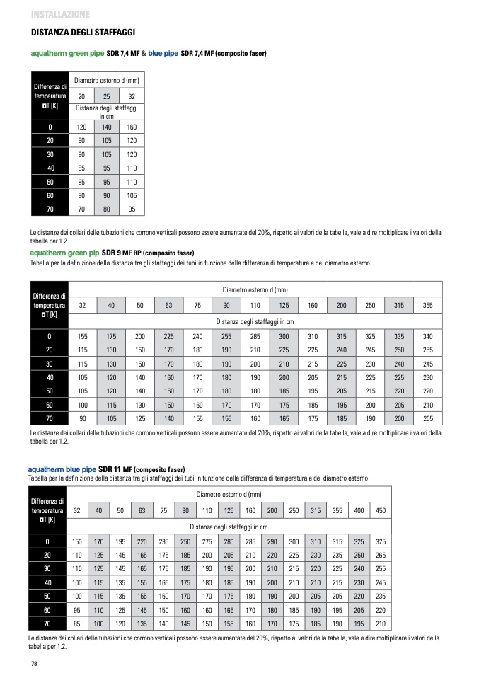 Le distanze dei collari delle tubazioni che corrono verticali possono essere aumentate del 20%, rispetto ai valori della tabella, vale a dire moltiplicare i valori della