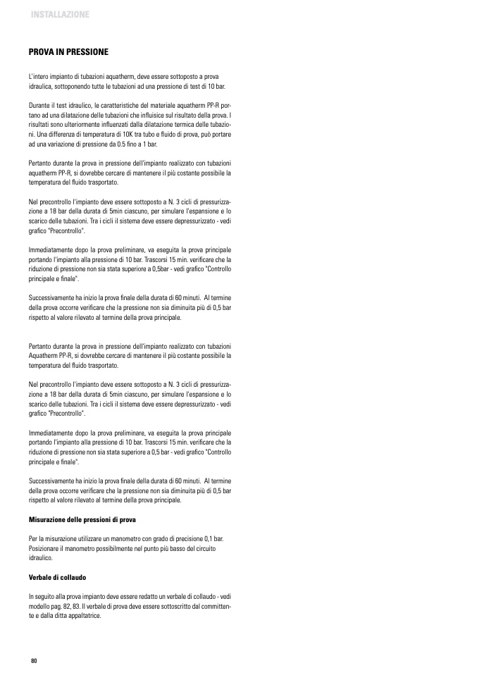 L'intero impianto di tubazioni aquatherm, deve essere sottoposto a prova