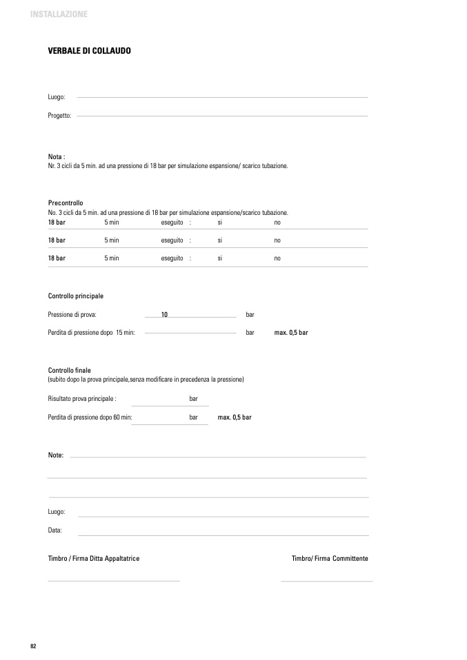 No. 3 cicli da 5 min. ad una pressione di 18 bar per simulazione espansione/scarico tubazione.