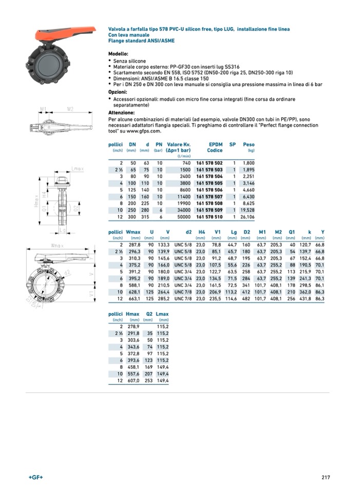Valvola a farfalla tipo 578 PVC-U silicon free, tipo LUG, installazione fine linea