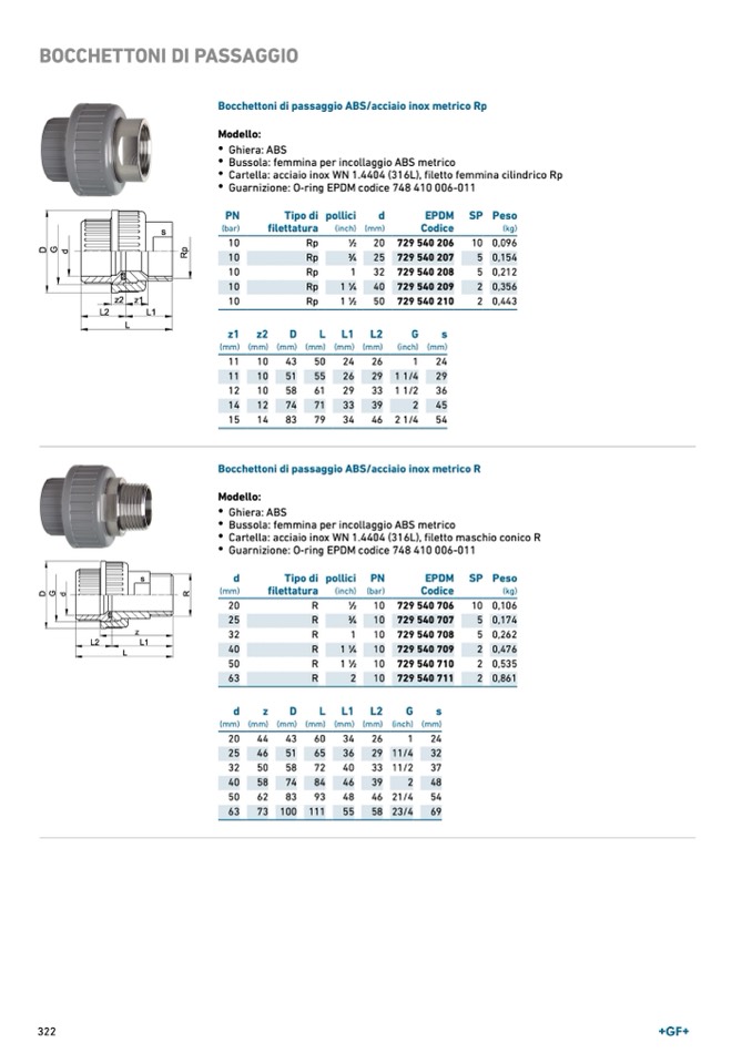 Bocchettoni di passaggio ABS/acciaio inox metrico Rp
