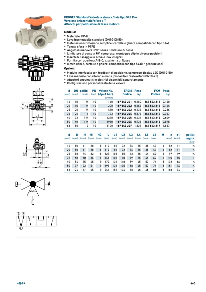 PROGEF Standard Valvola a sfera a 3 vie tipo 543 Pro
