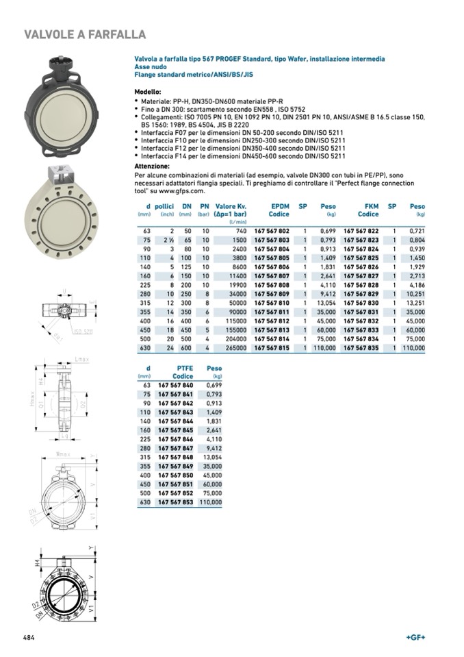 Valvola a farfalla tipo 567 PROGEF Standard, tipo Wafer, installazione intermedia