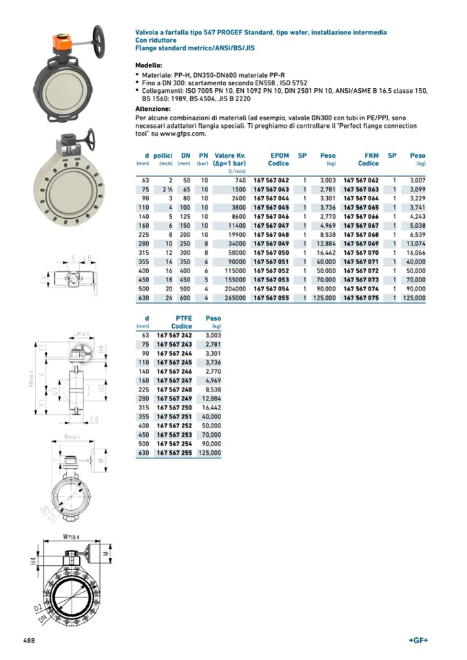 Valvola a farfalla tipo 567 PROGEF Standard, tipo wafer, installazione intermedia