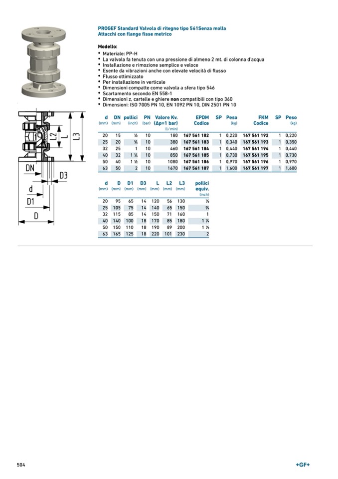PROGEF Standard Valvola di ritegno tipo 561Senza molla