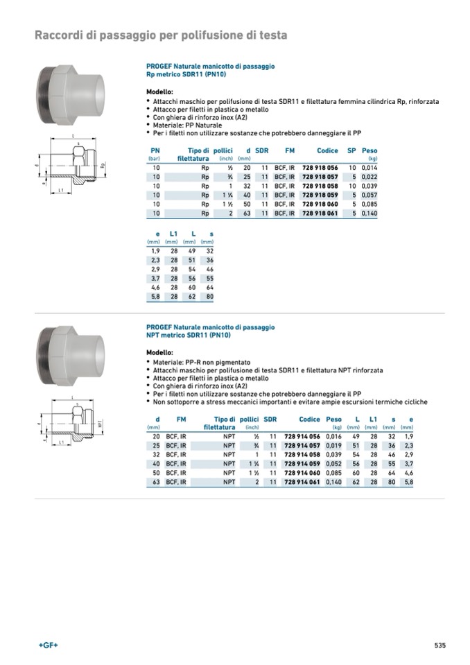 Attacchi maschio per polifusione di testa SDR11 e filettatura femmina cilindrica Rp, rinforzata