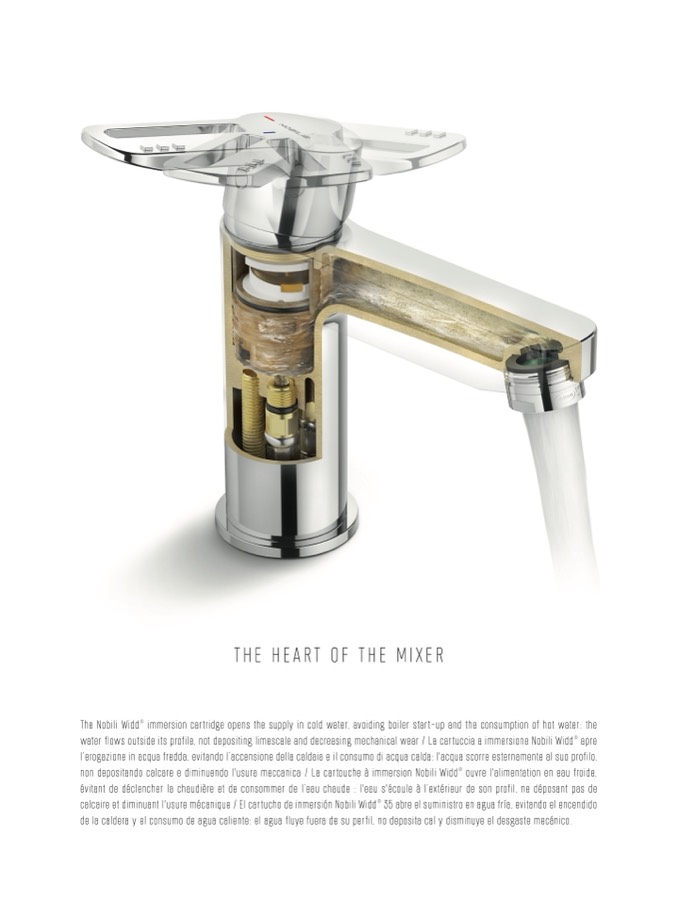 water flows outside its profile, not depositing limescale and decreasing mechanical wear / La cartuccia a immersione Nobili Widd