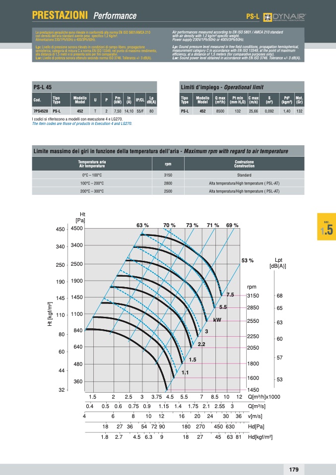 Le prestazioni aerauliche sono rilevate in conformità alla norma EN ISO 5801/AMCA 210
