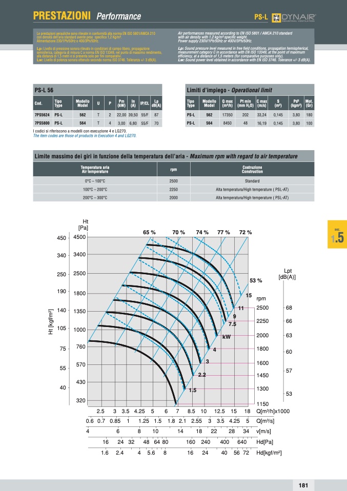 Le prestazioni aerauliche sono rilevate in conformità alla norma EN ISO 5801/AMCA 210