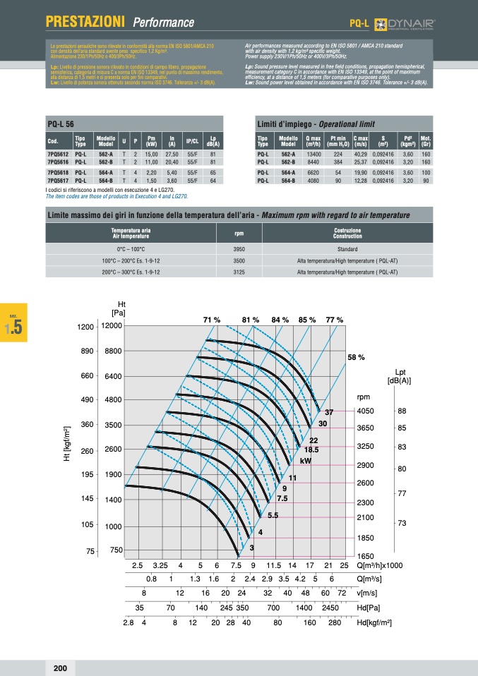 Le prestazioni aerauliche sono rilevate in conformità alla norma EN ISO 5801/AMCA 210