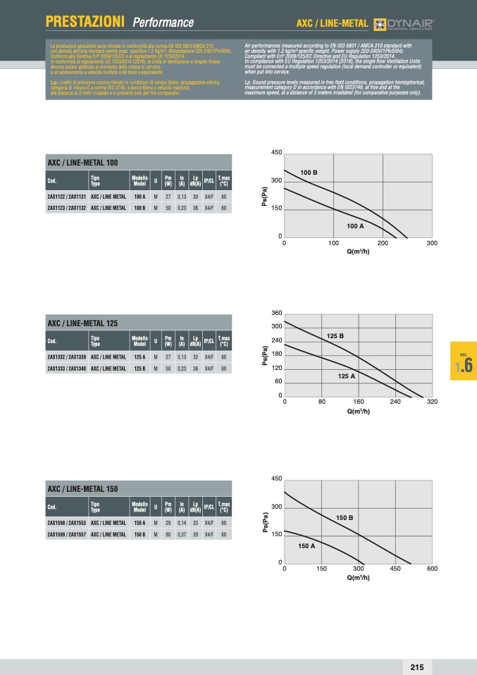 Le prestazioni aerauliche sono rilevate in conformità alla norma EN ISO 5801/AMCA 210