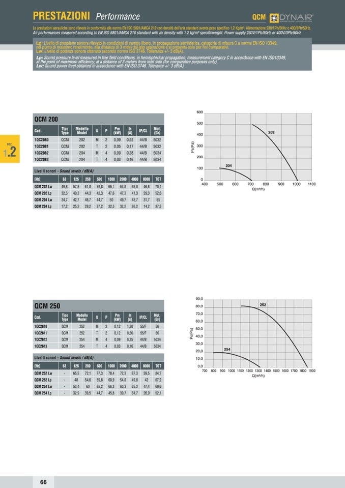 Le prestazioni aerauliche sono rilevate in conformità alla norma EN ISO 5801/AMCA 210 con densità dell’aria standard avente peso specifico 1,2 Kg/m3. Alimentazione 230/1Ph/50Hz o 400/3Ph/50Hz.