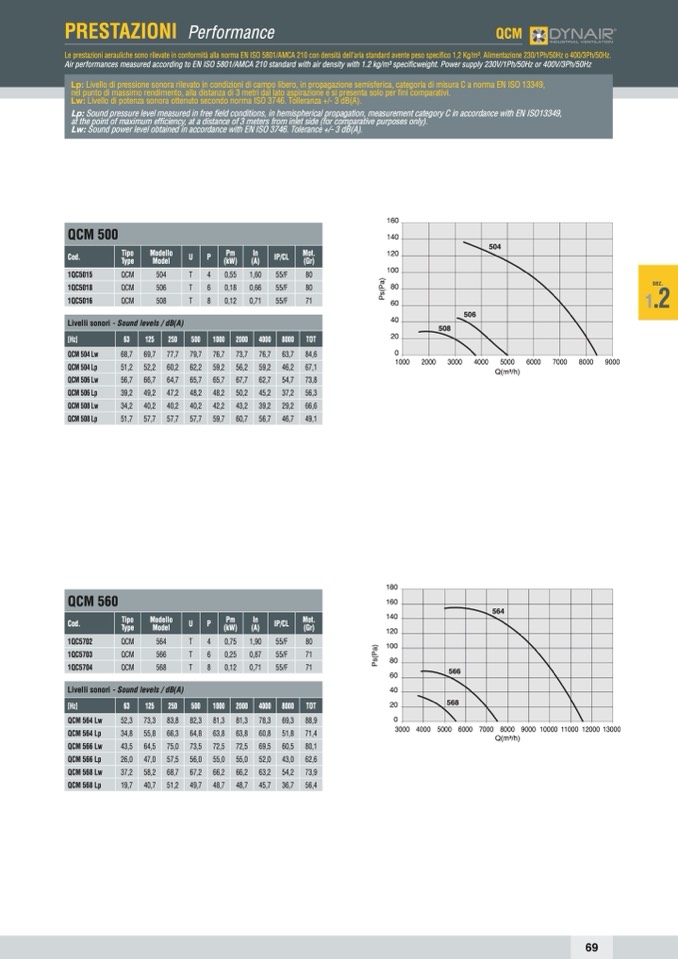 Le prestazioni aerauliche sono rilevate in conformità alla norma EN ISO 5801/AMCA 210 con densità dell’aria standard avente peso specifico 1,2 Kg/m3. Alimentazione 230/1Ph/50Hz o 400/3Ph/50Hz.