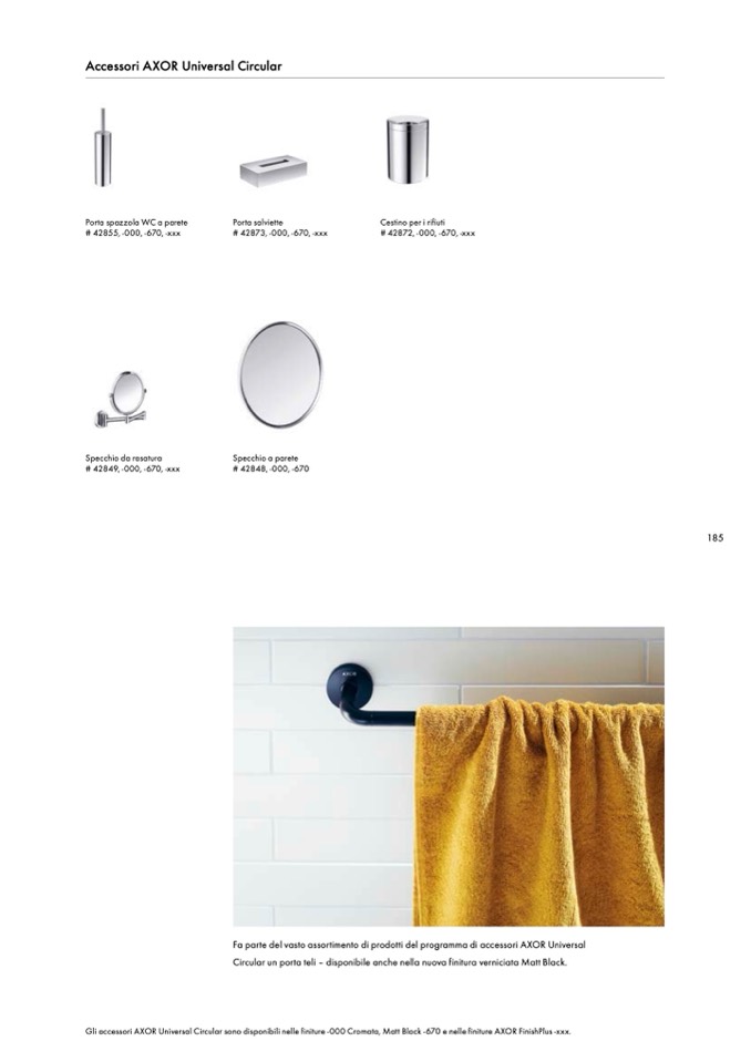 Gli accessori AXOR Universal Circular sono disponibili nelle finiture -000 Cromata, Matt Black -670 e nelle finiture AXOR FinishPlus -xxx.