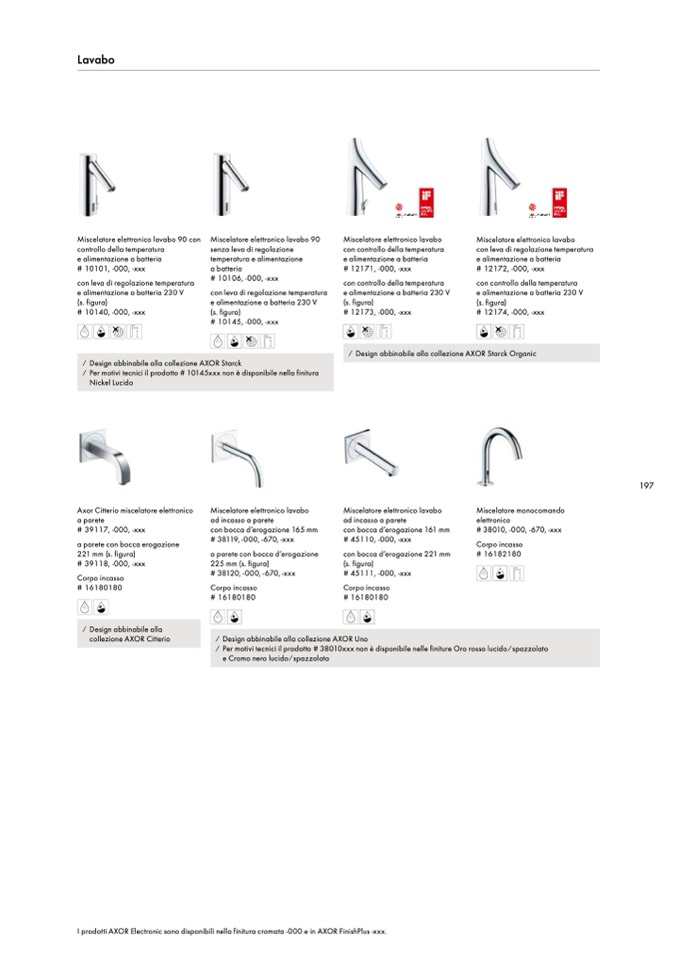 I prodotti AXOR Electronic sono disponibili nella finitura cromata -000 e in AXOR FinishPlus -xxx.