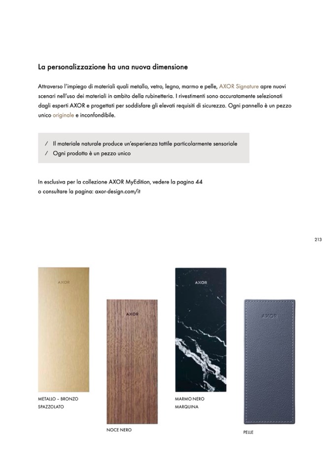 Attraverso l’impiego di materiali quali metallo, vetro, legno, marmo e pelle, AXOR Signature apre nuovi
