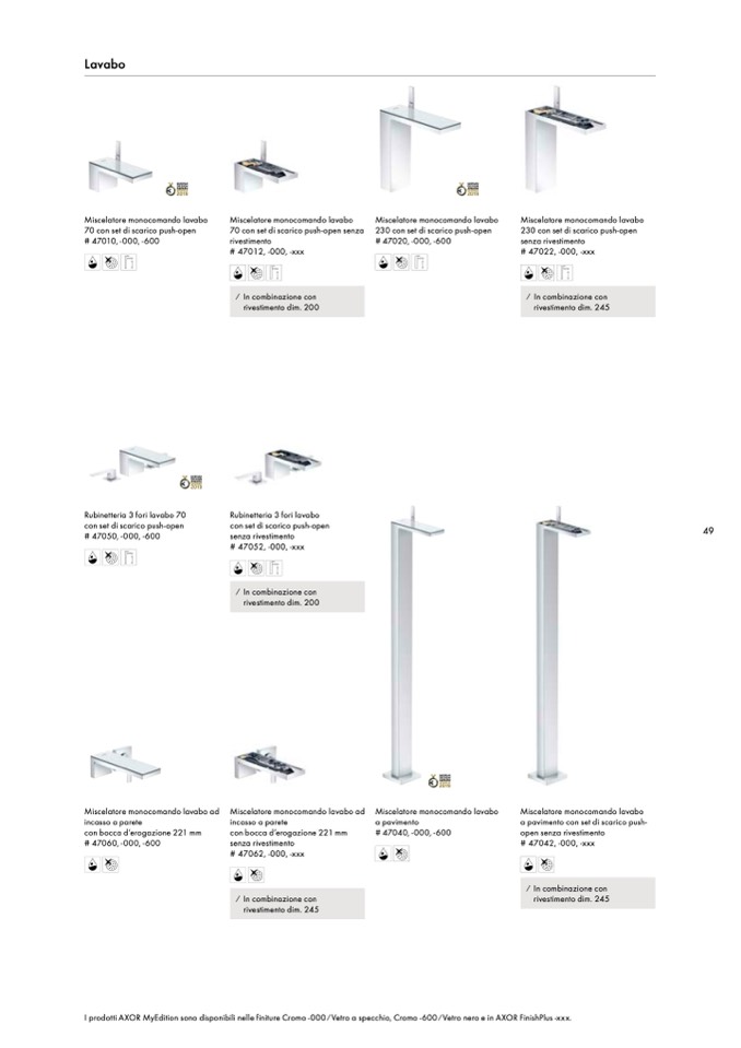 I prodotti AXOR MyEdition sono disponibili nelle finiture Cromo -000 ⁄ Vetro a specchio, Cromo -600 ⁄ Vetro nero e in AXOR FinishPlus -xxx.