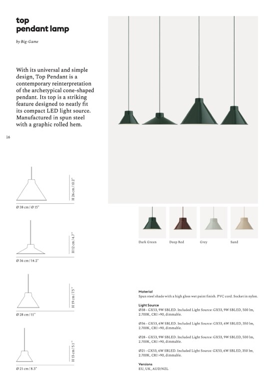 Spun steel shade with a high gloss wet paint finish. PVC cord. Socket in nylon.