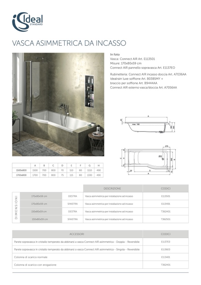 Parete sopravasca in cristallo temperato da abbinarsi a vasca Connect AIR asimmetrica - Singola - Reversibile