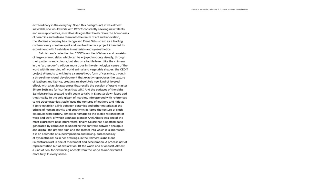 Salmistraro’s collection for CEDIT is entitled Chimera and consists