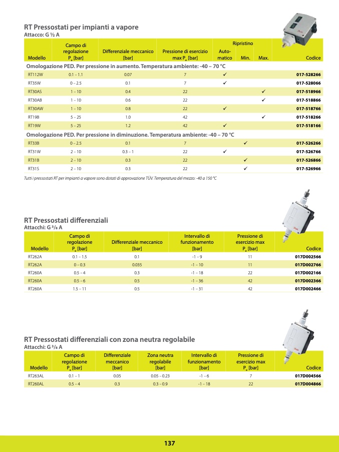 Tutti i pressostati RT per impianti a vapore sono dotati di approvazione TÜV. Temperatura del mezzo: -40 a 150 °C