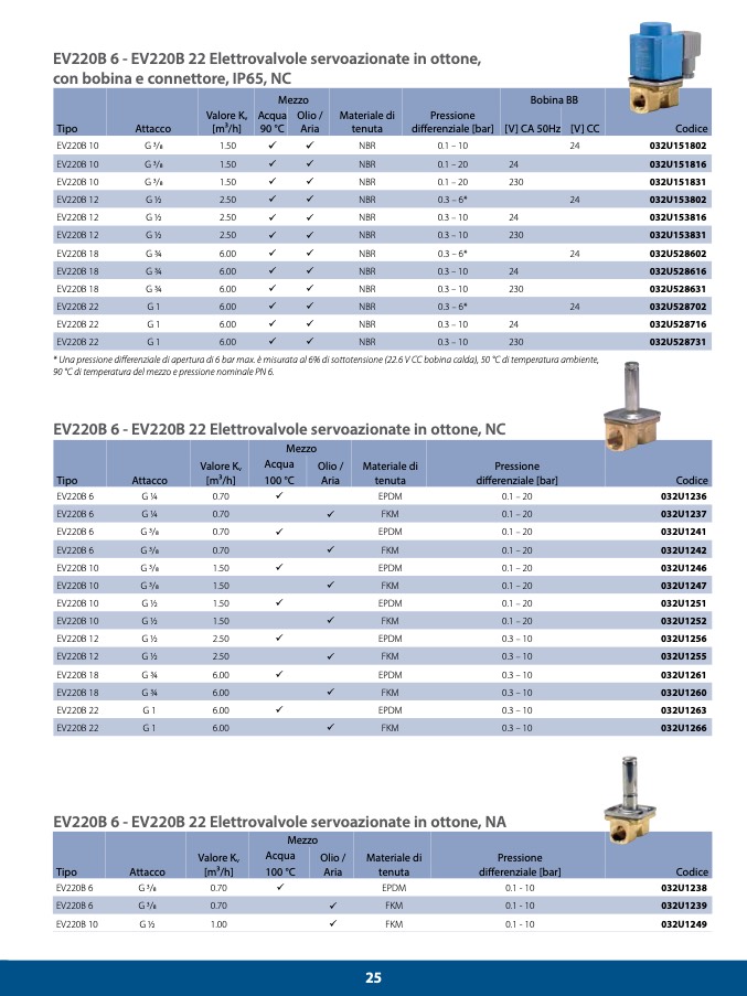 * Una pressione differenziale di apertura di 6 bar max. è misurata al 6% di sottotensione (22.6 V CC bobina calda), 50 °C di temperatura ambiente,