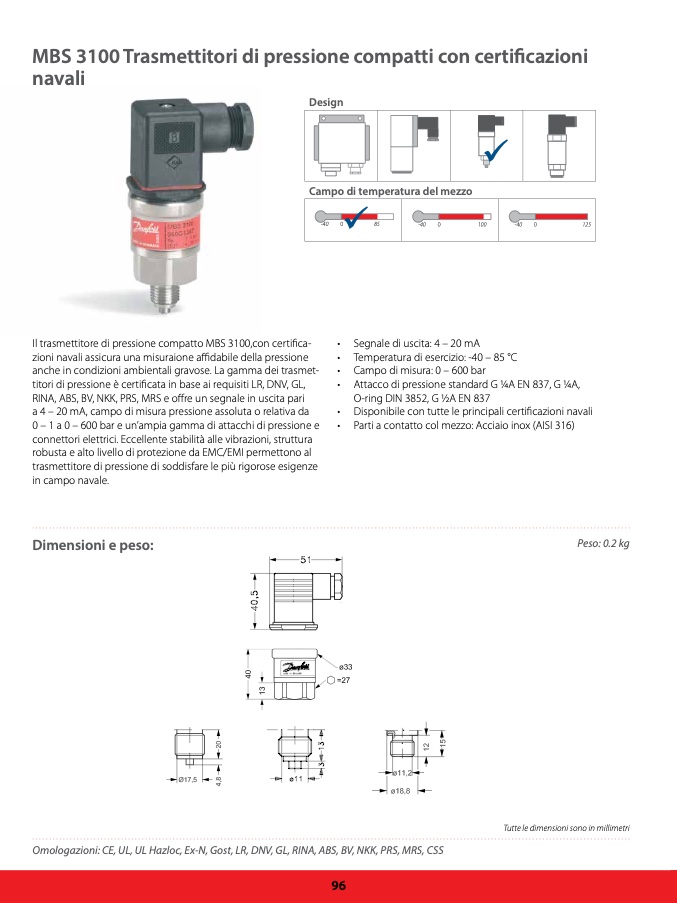 Il trasmettitore di pressione compatto MBS 3100,con certifica-