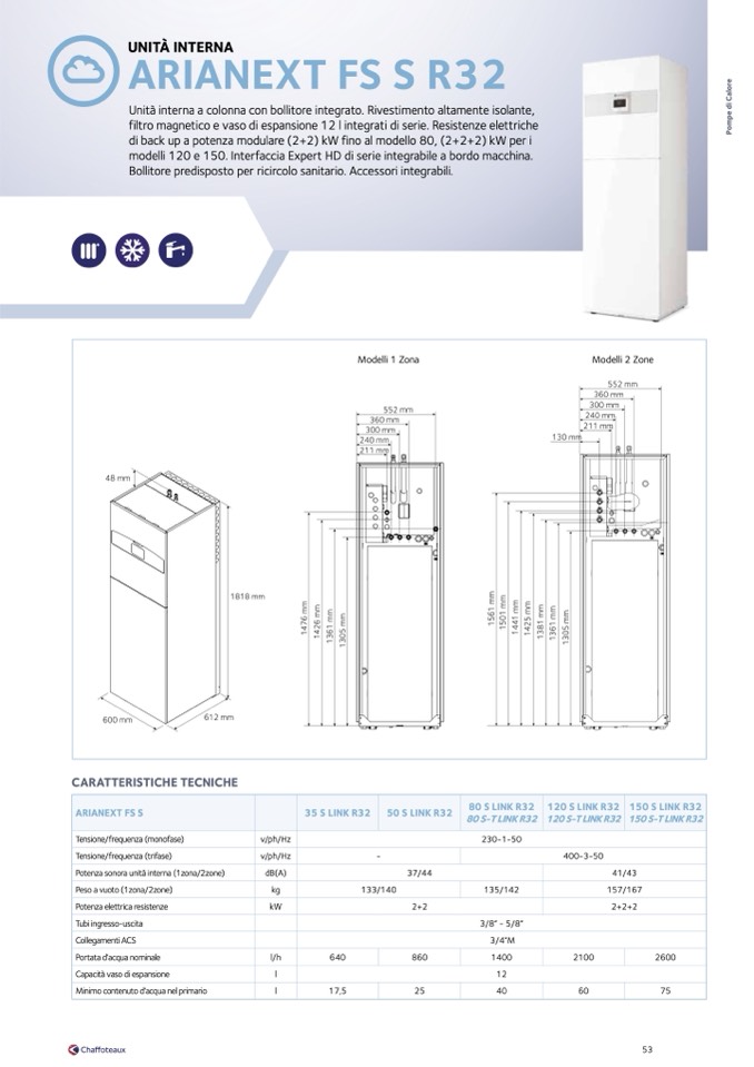 Unità interna a colonna con bollitore integrato. Rivestimento altamente isolante,
